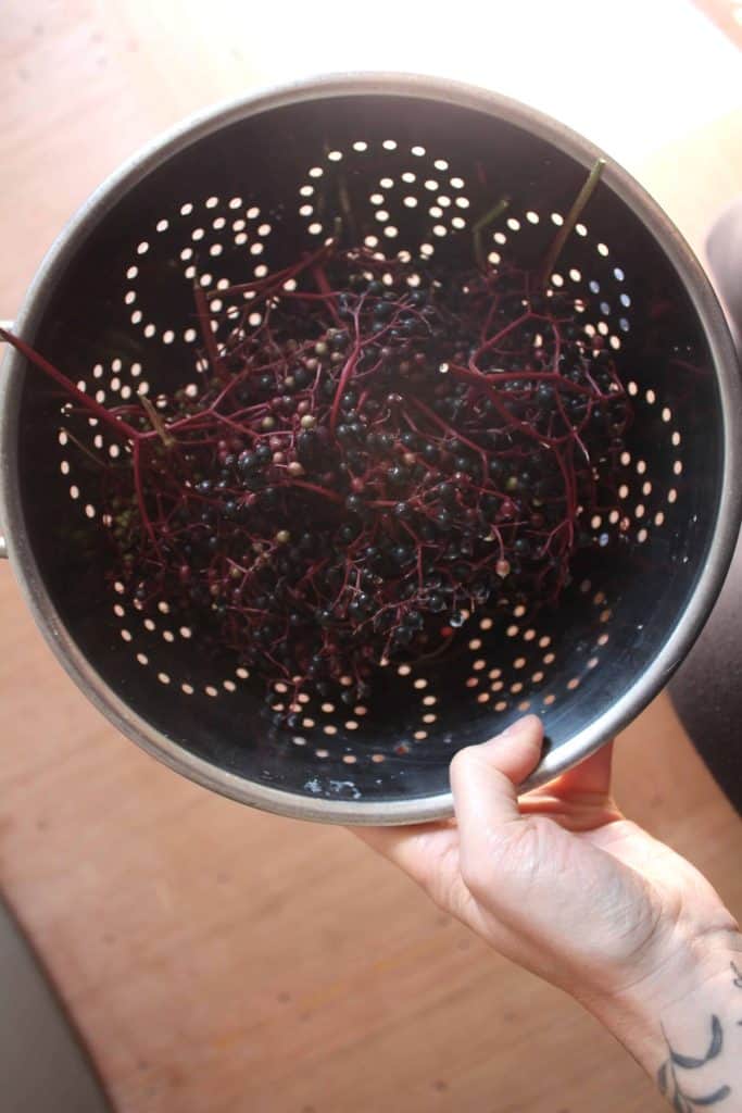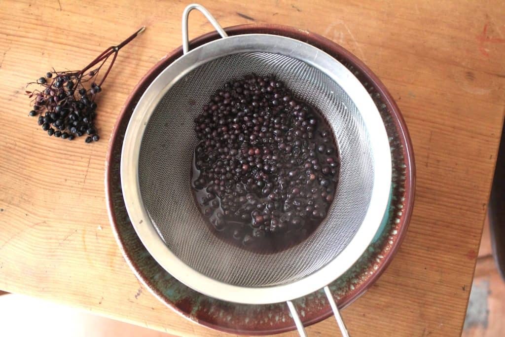 - Pour the mixture through cheesecloth into a glass bowl or measuring cup. Elderberries have tiny seeds that can irritate your stomach and they can fit through my strainer so I use cheesecloth instead.