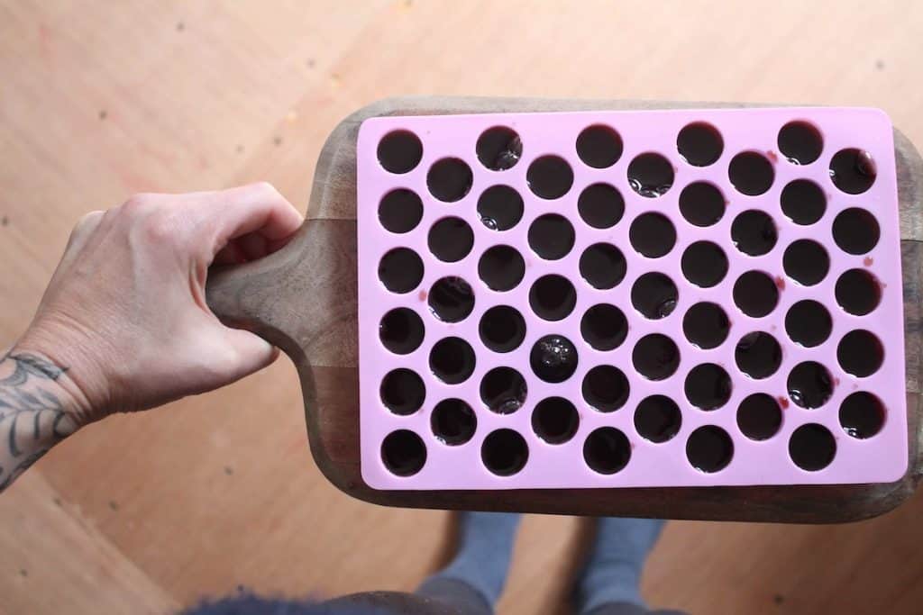 Pour the liquid into silicone gummy molds or a glass baking dish. I like to use gummy bear molds because they’re fun for the kids but I usually just use a shallow baking dish and knife to cut out the gummies! If you use a mold, it’s best to use a dropper to avoid spilling syrup everywhere!