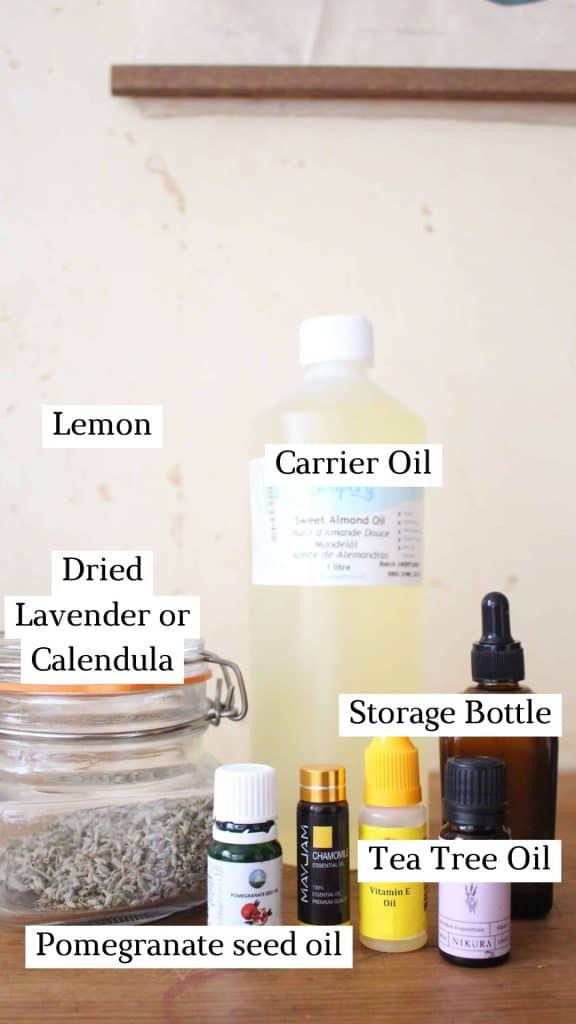Base oil of your choice – which kind of oil you choose depends on your skin type. I’ve listed good oils for different skin types (such as dry skin, oily skin, etc) above this section. I like using jojoba oil but you can also use good quality olive oil, sweet almond oil, avocado oil, or fractionated coconut oil)